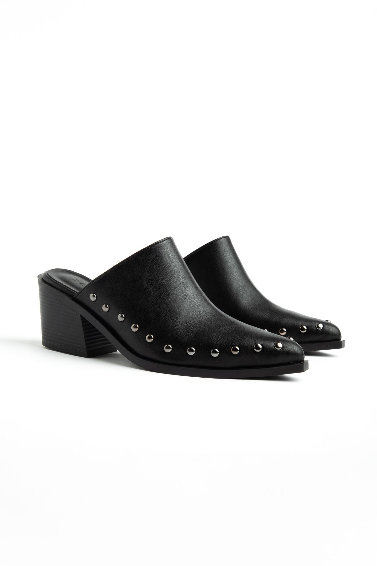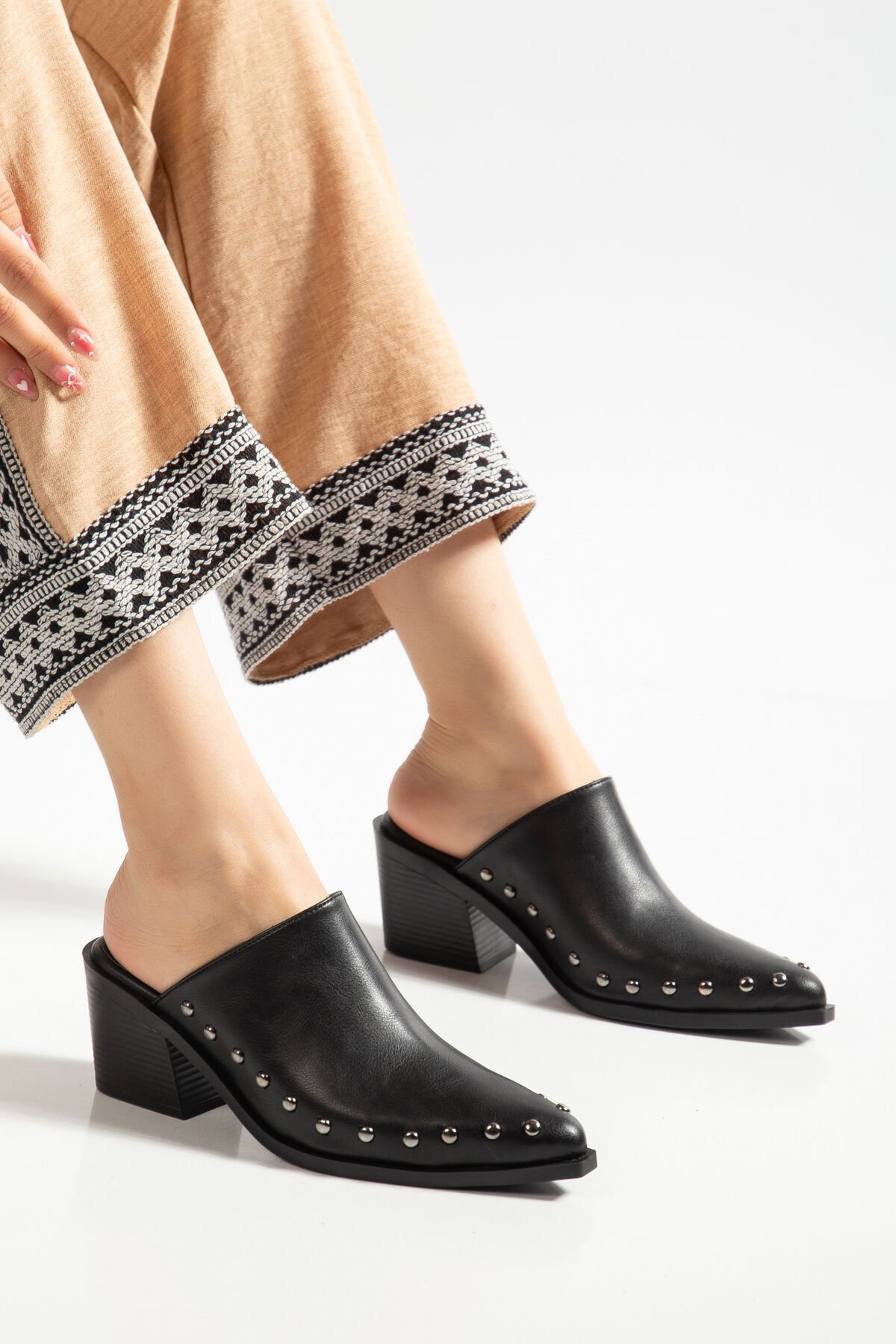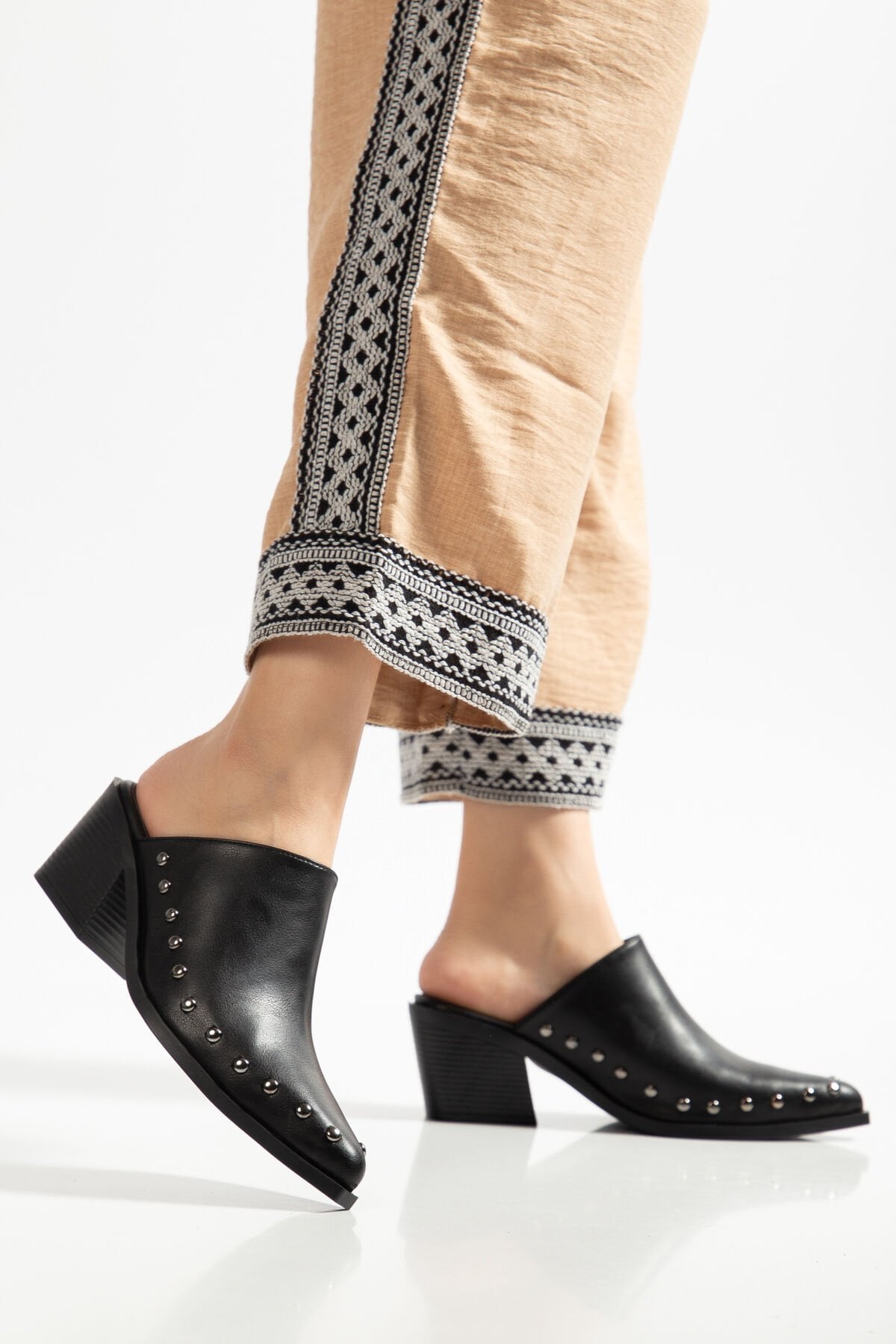 Siyah Mat Deri Nakışlı Zımba Detay Terlik 4422